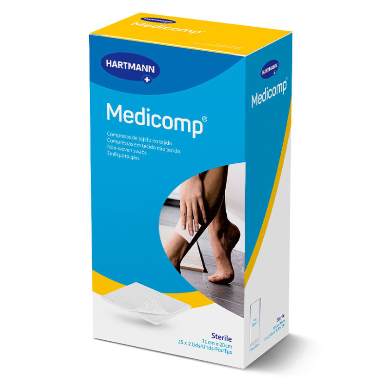 Gasas estériles Medicomp de alta absorción, ideales para curas de heridas y pequeñas intervenciones. Non-woven 70% viscosa, 30% poliéster. Pack de 50ud. Producto sanitario CE clase IIa.