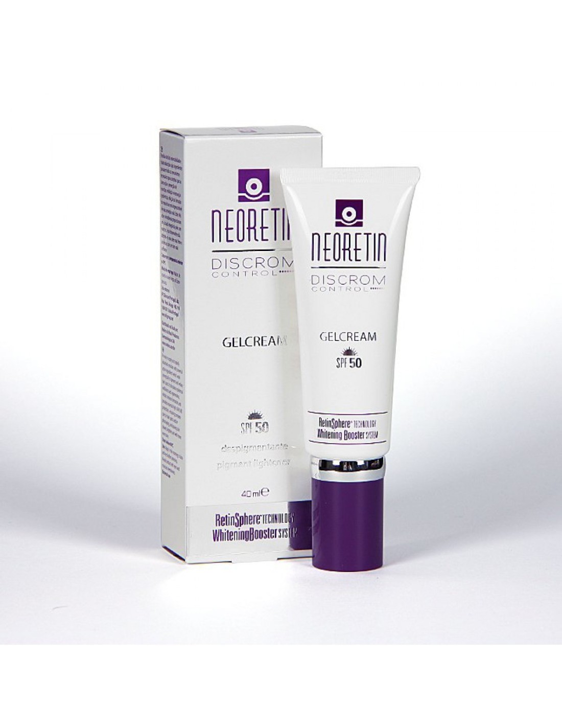 Neoretin Discrom Control Gel Cream SPF50 40 ml protege del sol, reduce manchas y unifica el tono con acción despigmentante y textura ligera de rápida absorción.