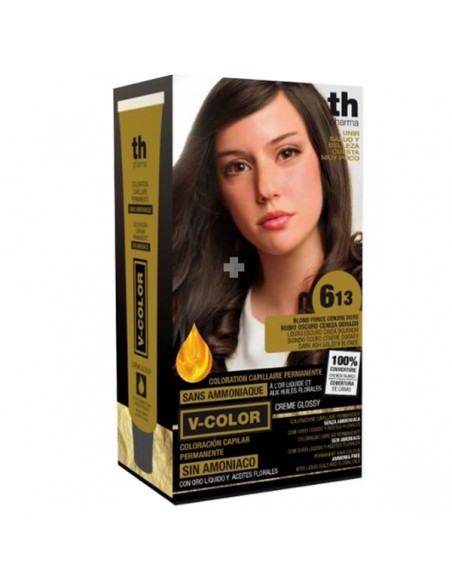 TH Pharma V-Color Nº6.13 Rubio Oscuro Ceniza Dorado Sin Amoniaco tinte sin amoníaco. Rubio oscuro equilibrado con reflejos ceniza y dorados, brillo y cobertura total de canas.