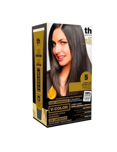 TH Pharma V-Color Nº5 Castaño Claro Sin Amoniaco tinte permanente sin amoníaco. Castaño claro natural, cobertura total de canas y brillo con aceites nutritivos.