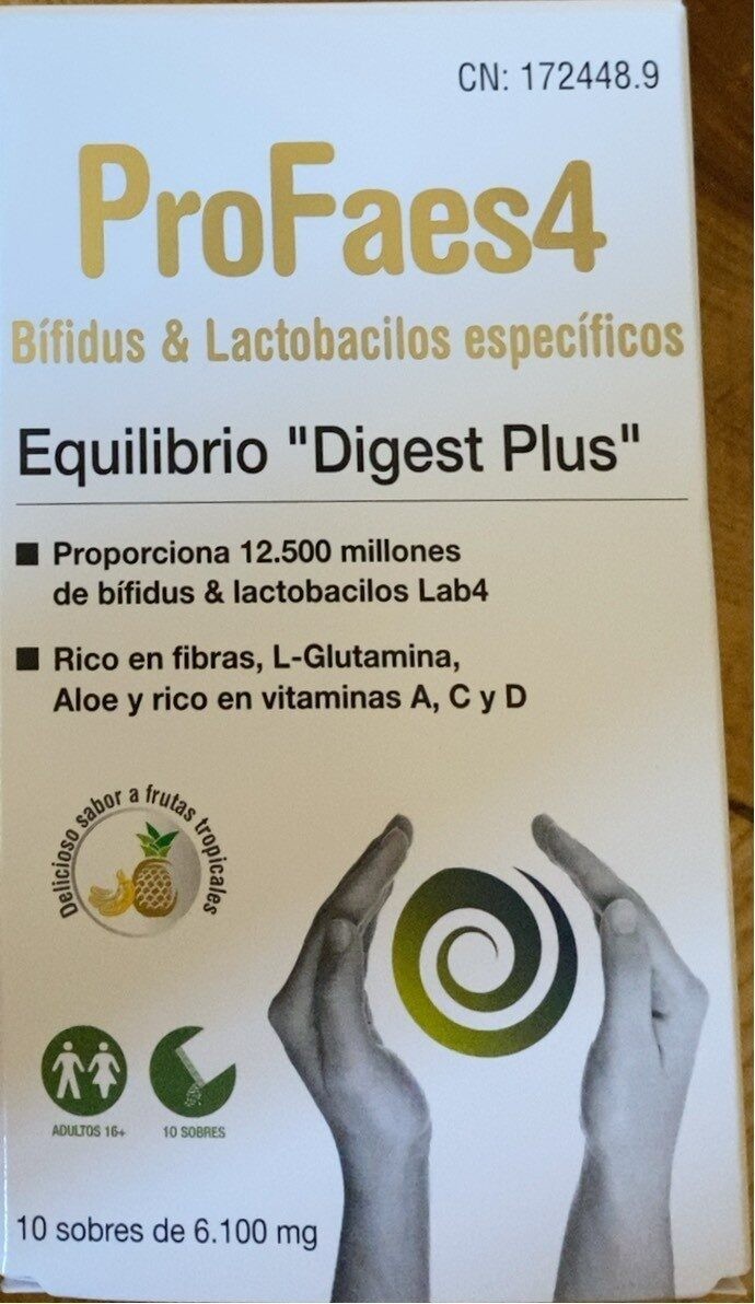 Profaes4 Equilibrio Digest Plus 10 sobres con probióticos Lab4, prebióticos y vitaminas. Ayuda a la flora intestinal y mejora el bienestar digestivo e inmunitario.