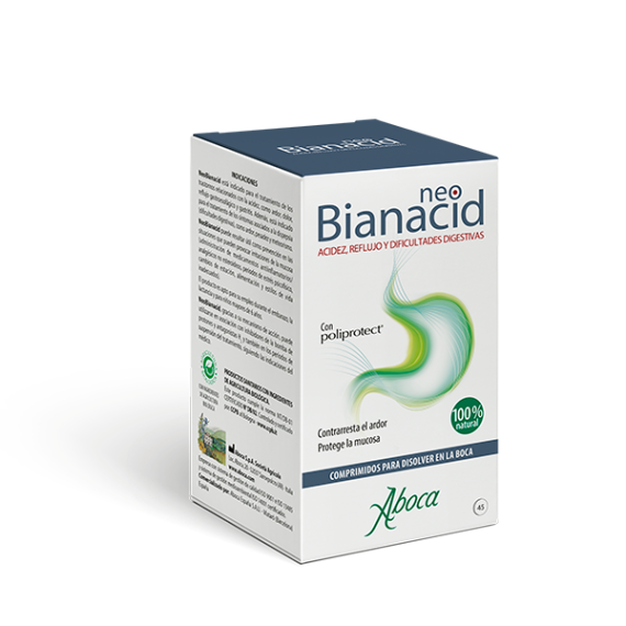 Aboca NeoBianacid Acidez y Reflujo es un producto sanitario de clase IIa, 100% natural, formulado con Poliprotect, un complejo molecular sinérgico de polisacáridos vegetales (algarrobo, malvavisco, aloe, caléndula) y minerales. Crea una película protectora mucoadhesiva sobre la mucosa gastroesofágica, reproduciendo el efecto del moco fisiológico natural.