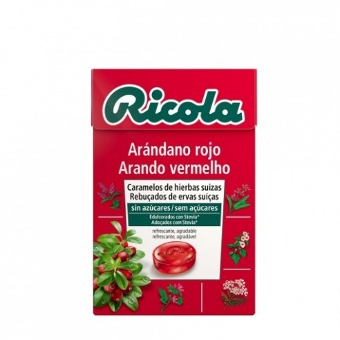 Caramelos balsámicos Ricola sin azúcar con sabor intenso a arándano rojo y 13 hierbas suizas. Refrescan la garganta, ricos en vitamina C, ideales para vías respiratorias. Sin gluten y sin lactosa.