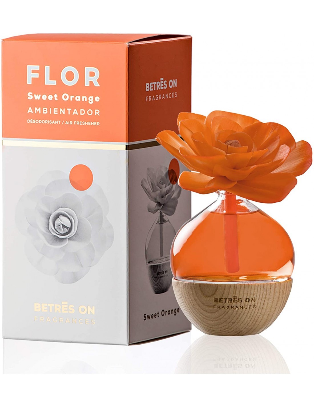 Betres On Ambientador Flor Sweet Orange 85 ml: fragancia cítrica dulce que perfuma tu hogar hasta 6 semanas. Diseño decorativo con efecto cambio de color.