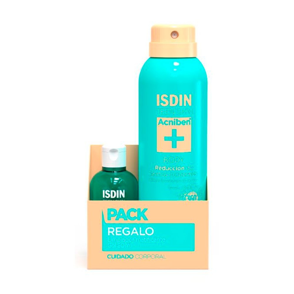Pack Isdin Teen Skin con spray corporal 150 ml y gel limpiador 50 ml. Combate granos e imperfecciones en espalda y pecho, controla sebo con ácidos salicílico y glicólico. Ideal para pieles grasa.