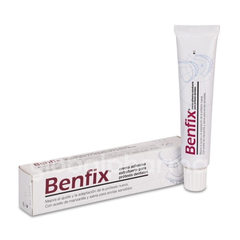 Benfix Adhesivo Dental 50 g asegura una sujeción firme y confortable de la prótesis durante todo el día, mejorando el ajuste y la adaptación de prótesis nuevas. Formulado con aceite de manzanilla y salvia, protege encías sensibles y previene irritaciones, filtraciones de alimentos y malos olores. Su aplicación es sencilla: limpia y seca la prótesis, aplica 3-4 bandas de crema, coloca la dentadura sobre la encía y presiona unos segundos. Permite masticar y hablar con seguridad, y se retira sin dolor. Sin látex y apto para uso diario.