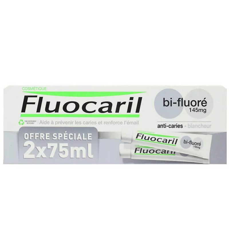 Dentífrico blanqueador Fluocaril Bi-Fluoré 145mg con doble acción fluorada. Elimina manchas, previene caries y restaura el blanco natural de tus dientes para una sonrisa luminosa. Pack duo 2x75 ml.