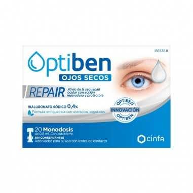 Optiben Ojos Secos Repair 20 Monodosis es una solución oftálmica estéril diseñada para aliviar la sequedad, irritación y fatiga ocular. Su fórmula avanzada combina hialuronato sódico 0,4% con extractos vegetales de ginkgo biloba, arándano, hinojo y centella asiática, proporcionando hidratación profunda, restaurando la película lagrimal y protegiendo la superficie ocular de factores ambientales como aire acondicionado, viento o exposición a pantallas. Su práctico formato en monodosis de 0,5 ml garantiza higiene y comodidad, permitiendo su uso en cualquier lugar. Compatible con lentes de contacto y apto para toda la familia, ofrece alivio rápido y duradero frente al ojo seco y la fatiga ocular.
