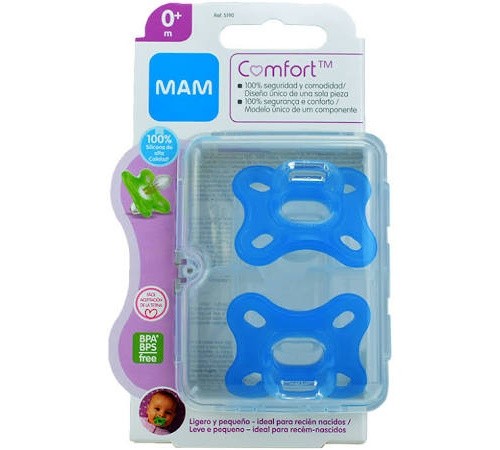 MAM Chupete Comfort Silicona Azul es la solución perfecta para el confort de tu bebé desde el primer día de vida. Este pack contiene 2 chupetes diseñados especialmente para recién nacidos.