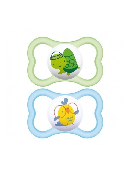 Disco con forma curvada para máximo confort, grandes orificios de ventilación y exclusivas formas cóncavas MAM en el interior que hacen el chupete agradable para la piel. Botón que brilla en la oscuridad facilitando localización nocturna por padres y bebés.