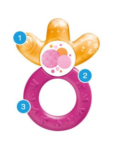 Mordedor infantil diseñado para aliviar el dolor de encías durante la dentición. Parte rellena de agua refrescante que calma y reconforta las encías sensibles del bebé. Forma curva especial que permite llegar hasta las muelas, con estructuras y relieves distintos que aportan sensaciones placenteras al morder y facilitan el proceso de dentición.