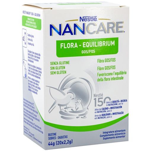 Nancare Flora Equilib es un complemento alimenticio probiótico de Nestlé diseñado para restaurar y equilibrar la flora intestinal de forma natural y efectiva.