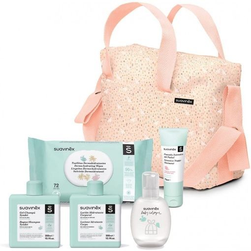 Bolso cosmética Suavinex para bebé en color rosa. Incluye toallitas húmedas, gel-champú, loción hidratante y colonia suave. Kit completo para el cuidado diario del bebé, suave y delicado.