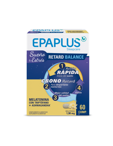 Epaplus Sleep Melatonina Retard: fórmula de liberación prolongada con 1.98mg de melatonina por comprimido. Mejora el sueño, reduce el tiempo de conciliación y favorece el descanso reparador. 60 comprimidos.