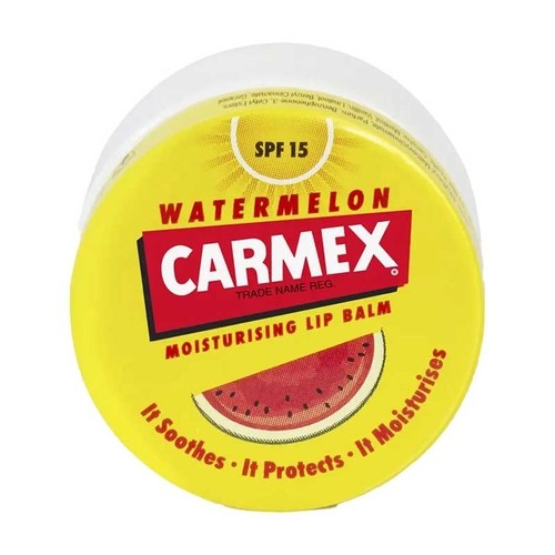 Bálsamo labial Carmex en tarro con sabor sandía y SPF15. Hidrata intensamente, repara labios agrietados y protege del sol. Ideal para labios secos y suaves.