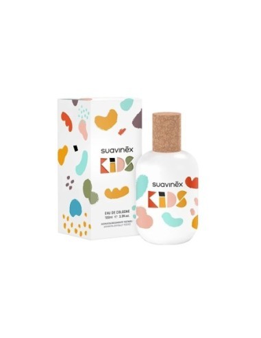Colonia infantil Suavinex Kids con fragancia fresca de lima, naranja, jazmín, almizcle y ámbar. Hipoalergénica, baja en alcohol, ideal para pieles sensibles. Envase 100 ml con juego creativo.