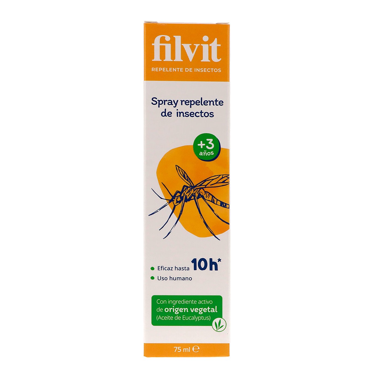 Spray repelente Filvit de origen natural. Hasta 12 h de protección contra mosquitos, garrapatas y otros insectos. Apto para adultos y niños +3 años.