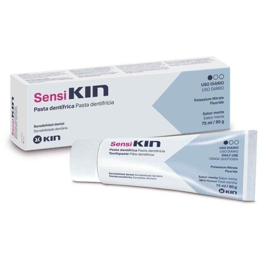 Pasta dental SensiKIN para sensibilidad dental. Alivia el dolor por estímulos térmicos, protege el esmalte y previene caries con nitrato potásico 5% y fluoruro 1450 ppm. Ideal para higiene diaria.