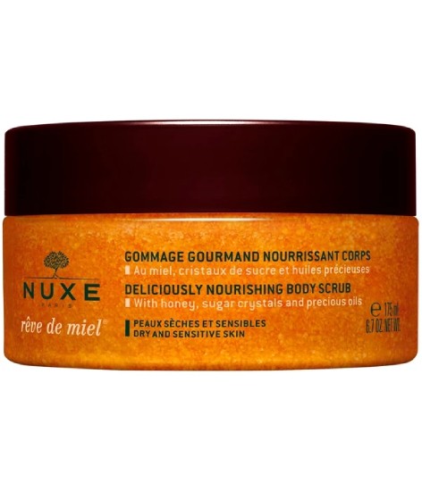 Descubre el Exfoliante Corporal Nutritivo Rêve de Miel® de Nuxe, un tratamiento en textura bálsamo de 175 ml diseñado específicamente para pieles secas y sensibles. Este exfoliante gourmand combina la acción exfoliante suave de sus partículas naturales con ingredientes nutritivos como miel de acacia, aceite de girasol y glicerina, eliminando las células muertas e impurezas mientras hidrata profundamente.