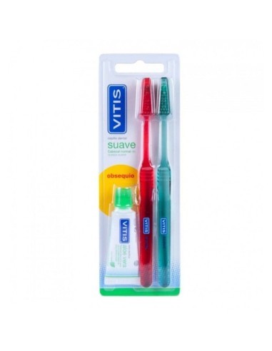 Vitis Cepillo Dental Duplo Suave es un pack de 2 cepillos diseñados para la higiene bucodental diaria de adultos. Cada cepillo cuenta con características ergonómicas y funcionales que garantizan una limpieza efectiva y cómoda.