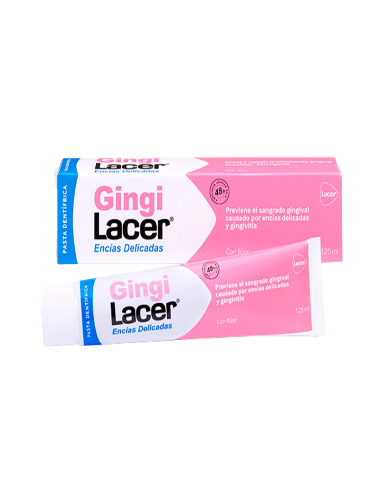 Gingilacer Pasta Dentífrica 125 ml cuida encías sensibles, previene y reduce gingivitis, sangrado y placa, ofreciendo protección integral y aliento fresco.