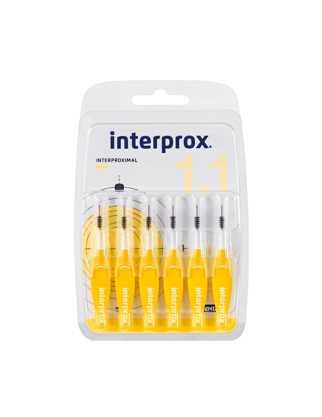 Cepillos interdental Interprox Mini para eliminar placa bacteriana en espacios de 1,1 mm. Ideal para ortodoncia, implantes y higiene bucal diaria. Pack de 6 uds con capuchón protector.