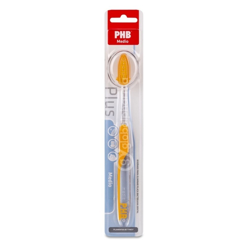 Cepillo dental PHB Plus Medio con filamentos de dureza media, cabezal compacto y mango ergonómico. Ideal para higiene bucal diaria y limpieza eficaz sin dañar encías sanas.