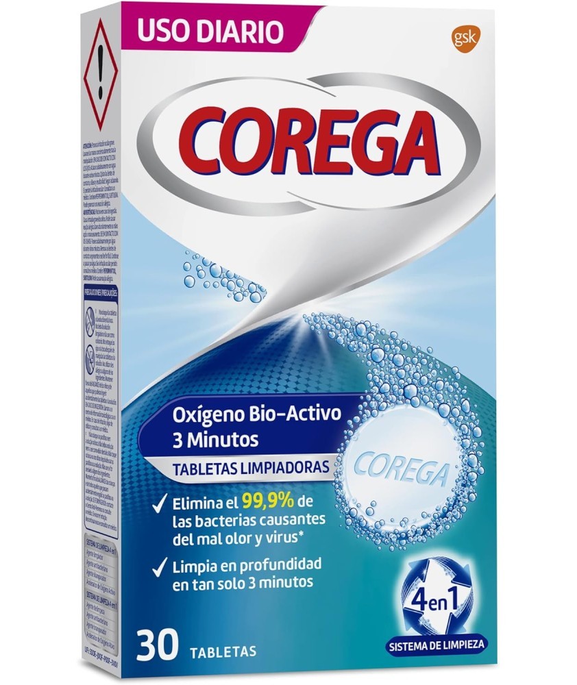 Tabletas efervescentes limpiadoras para prótesis dentales. Elimina 99.9% bacterias y virus causantes de mal olor. Acción blanqueadora anti-manchas. 30 tabletas. Uso diario o nocturno.