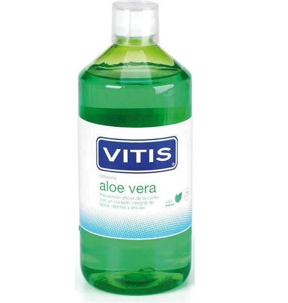 Colutorio Vitis Aloe Vera sin alcohol con sabor menta. Protege boca, dientes y encías, previene caries y placa bacteriana. Ideal para higiene bucal diaria con aloe vera y pantenol. Formato ahorro.