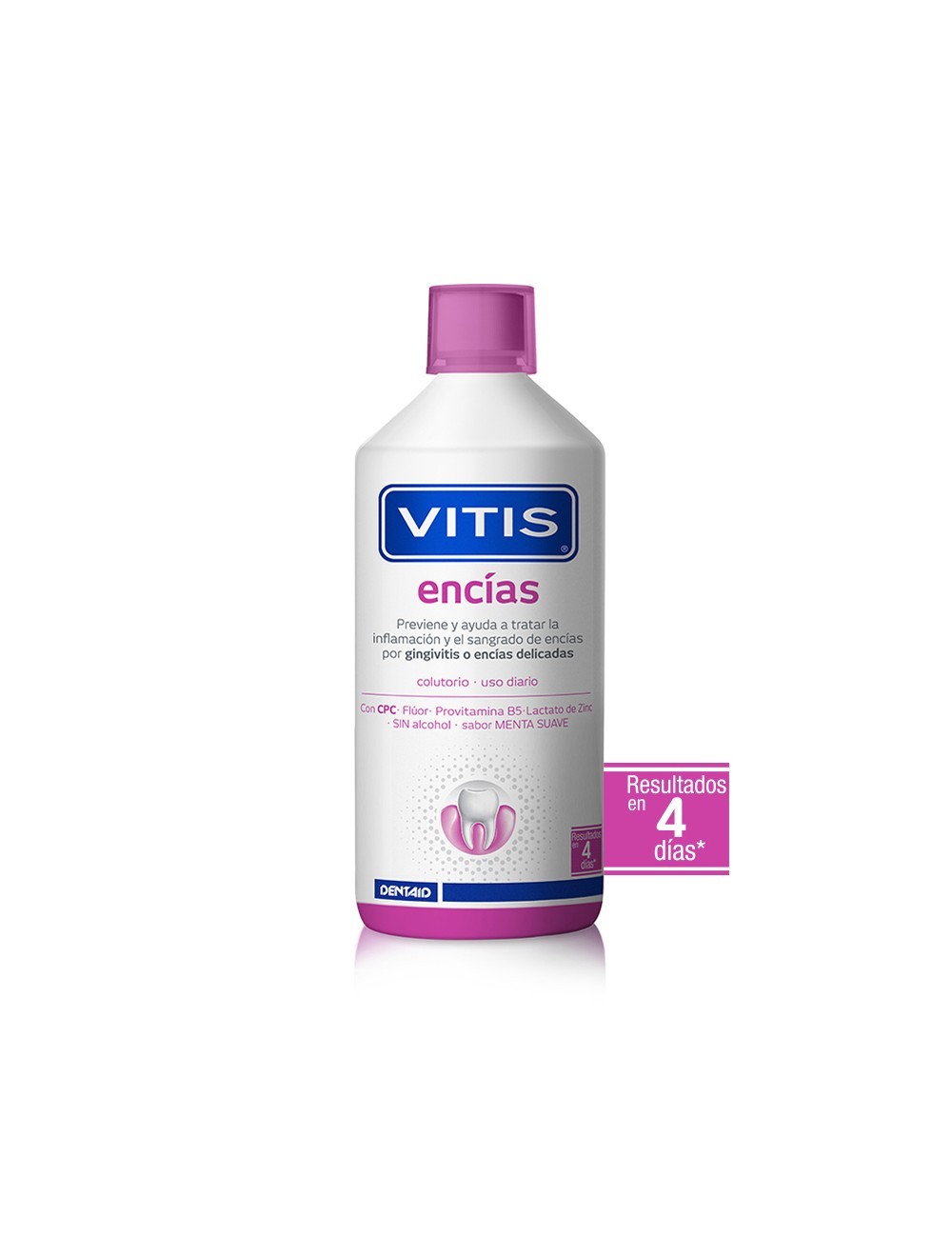 El Colutorio VITIS Encías 1000 ml es un enjuague bucal específicamente formulado para prevenir y controlar la gingivitis, reduciendo el sangrado, la inflamación y la sensibilidad de las encías. Ideal como complemento diario a la pasta dentífrica para personas con encías delicadas, inflamadas o predispuestas a problemas periodontales.