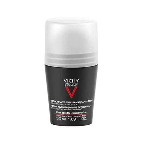 Descubre el Desodorante Roll-On Vichy Homme para Pieles Sensibles 48h, formulado específicamente para hombres con piel delicada. Este antiperspirante de alta eficacia ofrece protección antitranspirante hasta 48 horas, controlando la sudoración de manera óptima sin irritaciones.