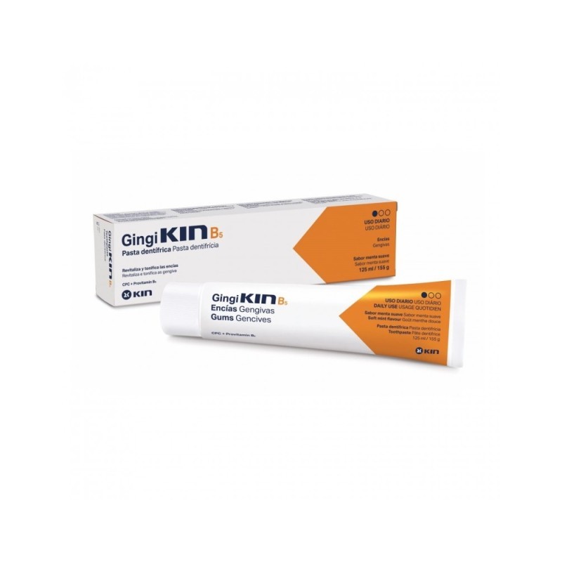 Pasta dentífrica GingiKIN B5 para el cuidado diario de encías y dientes. Controla el biofilm, fortalece encías, previene caries. Con CPC, zinc y provitamina B5. Sabor menta suave.