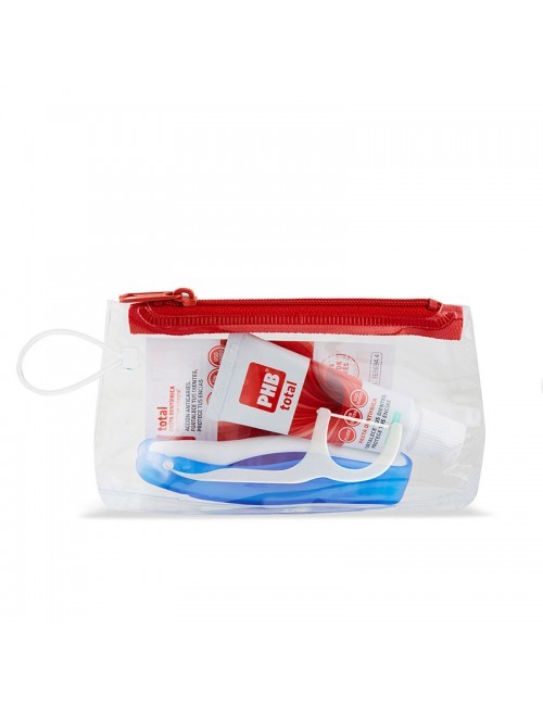 Kit de higiene bucal de viaje con cepillo plegable y pasta dental PHB Total 15ml. Cerdas suaves Tynex, 1450ppm flúor anticaries. Formato compacto para bolso o equipaje. Ideal desplazamientos.