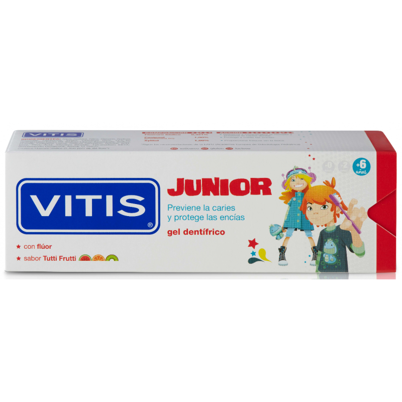 Vitis Junior Gel Dentífrico con Flúor Tutti Frutti 75 ml es un producto de higiene bucodental especialmente diseñado para niños mayores de 6 años, durante la erupción de la dentición definitiva.
