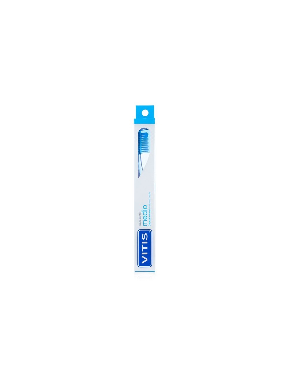 Vitis® Cepillo Dental Medio es un cepillo de uso diario diseñado especialmente para eliminar eficazmente el biofilm bucal (placa bacteriana) con filamentos de dureza media.