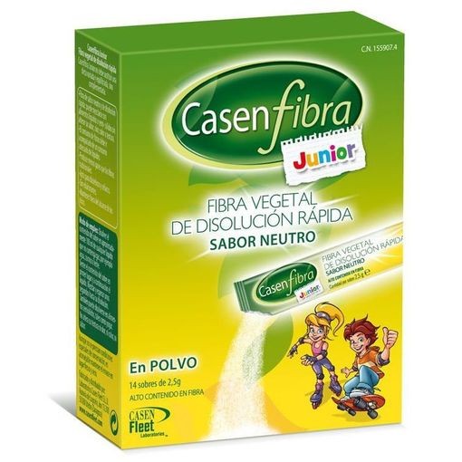 Casenfibra Junior es un complemento alimenticio en polvo diseñado especialmente para niños, que proporciona una combinación óptima de fibra vegetal fermentable (75%) y no fermentable (25%), obtenida de maltodextrina resistente (62,5%) y frutooligosacáridos (37,5%).