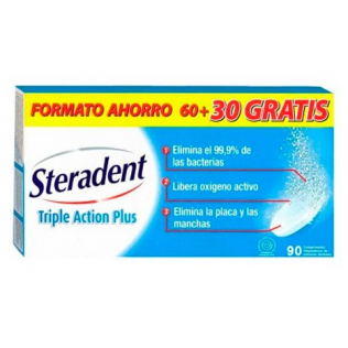 Steradent 3X2 Triple Acción Plus es la solución completa para la limpieza y desinfección de prótesis dentales totales o parciales. Este producto ofrece una acción 3 en 1 potenciada por oxígeno activo que garantiza resultados profesionales en el cuidado de tu dentadura postiza.