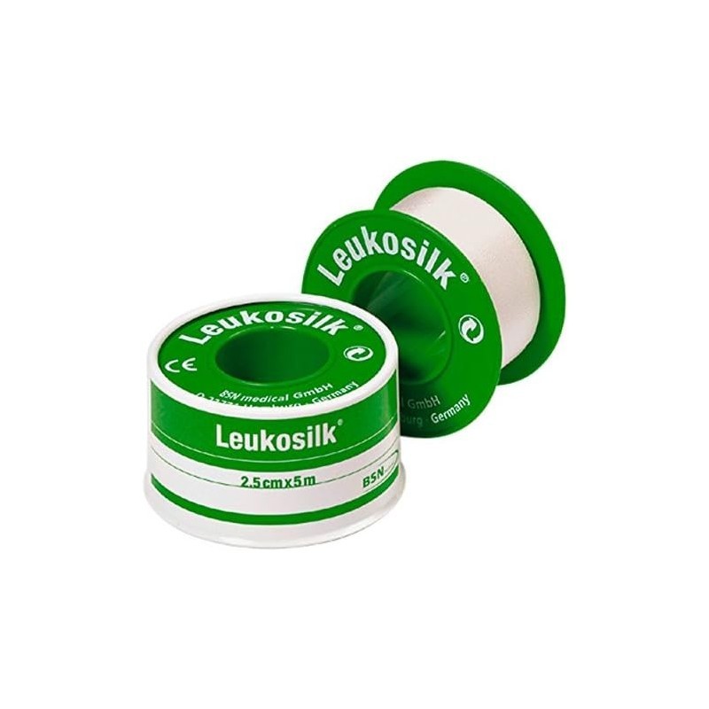 Esparadrapo Leukosilk de alta calidad en rollo de 5m x 2,5cm. Hipoalergénico, sin látex, ideal para fijar apósitos, tubos y catéteres de forma segura y cómoda.