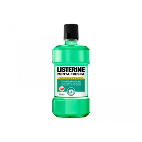 Listerine Menta Fresca 500 ml elimina el 99% de bacterias, previene placa y gingivitis, y proporciona 24 h de aliento fresco y protección para una boca más sana.